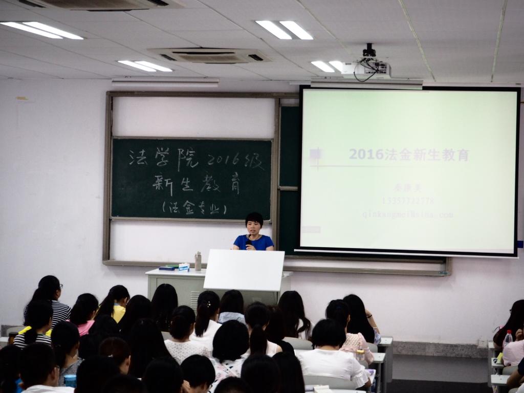 法务金融专业方向的新生则在秦康美老师的主讲下了解了南审法金专业方向的历史和发展方向。秦老师生动地描述了法律在社会中的地位,并为新生们分析了法务金融学生将来的毕业方向。围绕职业岗位对就业人员的要求、法金人才的特点以及优势、以往各届法金毕业生的就业情况这三个话题展开具体讲述后,秦老师强调,懂得法律和金融知识的复合型人才未来可以选择的职业非常多,前景可观!她还从考研和就业两个方面阐述了“‘我’在大学四年里该如何做能达到专业要求”这个问题,并分享了优秀毕业生的成功经验。