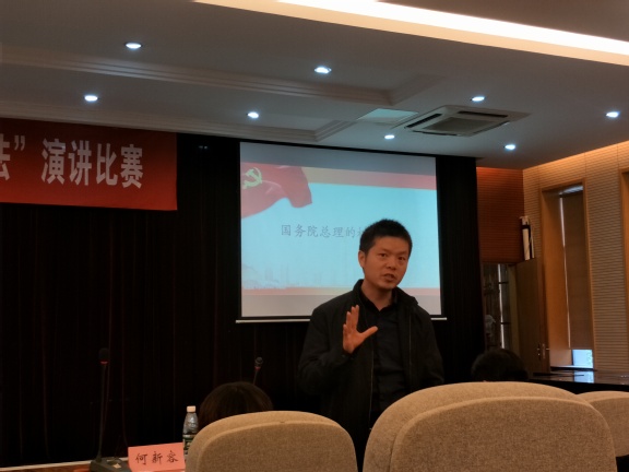 比赛伊始,全体在场人员共同观看了宪法宣传片,并进行了宣誓。接着,演讲比赛正式开始,七名入选选手从不同角度表述了自己对宪法的理解。大家结合具体法条,说明相关案例,从身边的事件说明宪法的重要性。此外,参赛选手们一致认为宪法是我国根本大法,需要每一个人去弘扬和遵守。随后,在命题演讲环节,七位选手围绕“为什么说我国是人民共和国”,“国务院总理的权力大吗”,“监察委员会与同级人大常委会的关系”,“如何理解宪法规定的‘法律面前人人平等’”做出了即兴演讲。