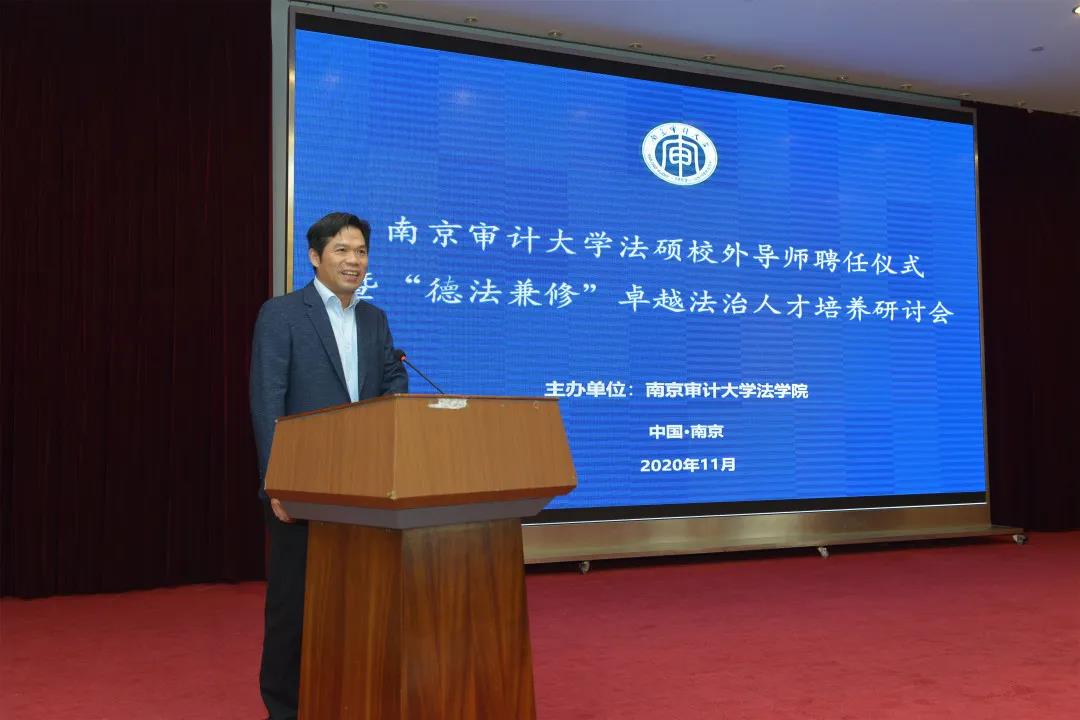 2020年11月1日上午,由无码直播 主办的无码直播 法律专硕校外导师聘任仪式暨“德法兼修”卓越法治人才培养研讨会在南京华东饭店D楼二楼多功能厅顺利举行。江苏省人大法制委员会主任委员王腊生、江苏省人力资源和社会保障厅副厅长顾潮、江苏省高级人民法院巡视员刘亚平等来自党政机关、司法系统和律师界的校外导师代表,无码直播 校领导、无码直播 党政领导班子、教师代表、部分法律硕士研究生等近百人参加了本次会议。无码直播 院长刘爱龙教授为本次聘任仪式暨研讨会的主持人。