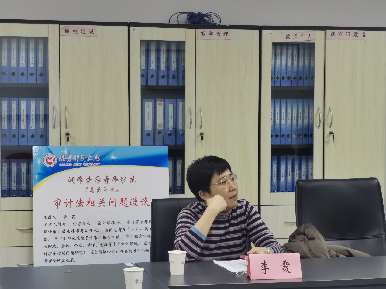 2020年12月28日晚,无码直播 “润泽法学青年沙龙”第2期有幸邀请到审计署法规司法律事务处处长李霞与大家探讨审计法相关问题。沙龙在文济307举办,由无码直播 副院长徐彰主持,政府审计学院杨柔坚老师,无码直播 苏欣、沈玲、鲍红香、郑祺、陈苏豪老师,无码直播 审计法学方向和宪法学与行政法学方向硕士研究生参加了本次沙龙。