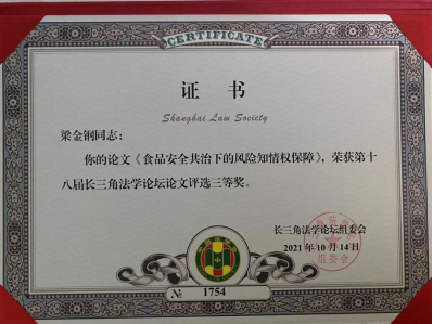 本次论坛共征集到论文442篇,论坛组委会经初评共评选出84篇优秀论文报送中国法学会会员部,中国法学会会员部进行论文学术不端检测,经检测共有84篇论文符合要求,可以进入终评。终评委员会遵循论文要紧扣主题、密切联系实际的原则,采用书面双向匿名评审的方式,于2021年8月2日—8月10日对进入终评的论文进行了评审。梁金钢同学的论文《食品安全共治下的风险知情权保障》获得本届论坛三等奖,并经组委会推荐,收录《上海法学研究》(集刊)公开发表。
