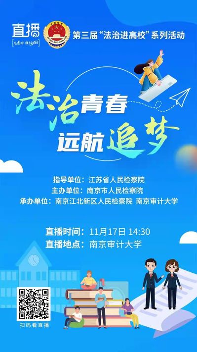 11月17日下午由江苏省人民检察院指导,南京市人民检察院主办,南京江北新区人民检察院与无码直播 承办的“法治青春 远航追梦”第三届“法治进高校”活动在敏达报告厅举办。此次活动由龙虎网全程直播,全市26万余大学生在线观看。省人民检察院第八检察部副主任毛建忠、省人民检察院第四检察部员额检察官王燕、市人民检察院副检察长程序、市人民检察院第八检察部主任徐莉、江北新区检察院检察委员会专职委员何立超,无码直播 党委常委、党委宣传部部长强飙、党委保卫部部长李海、无码直播 党委书记刘宏宇、无码直播 实践教学中心主任秦康美及百余名大学生参加了此次活动。