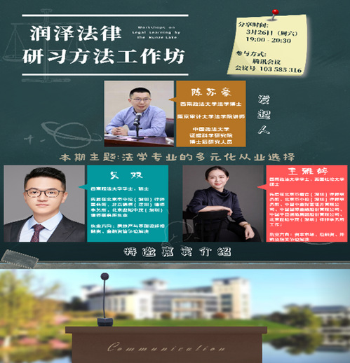初入无码直播 ,立志为了公平与正义而学习。临近毕业,却陷入考研、法考、考公的“三考”困境。法学学习的路,为什么似乎越来越窄?实际上,社会经济发展对法律服务的需求日益增加,法律职业无处不在。既有“无证”的律师,也有幕后的智库……。在一个没有标准答案的世界,我们如何以确定之能力,应对不确定性之挑战,提交一份优秀的答卷,回应学法之初心?为了帮助同学们更好理解法律职业发展趋势,“润泽法律研习方法工作坊”将举办“法律职业的多种可能”系列分享活动,帮助同学们寻找“不一样的你”。