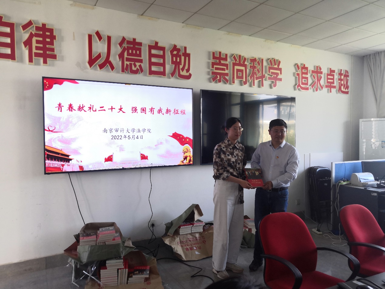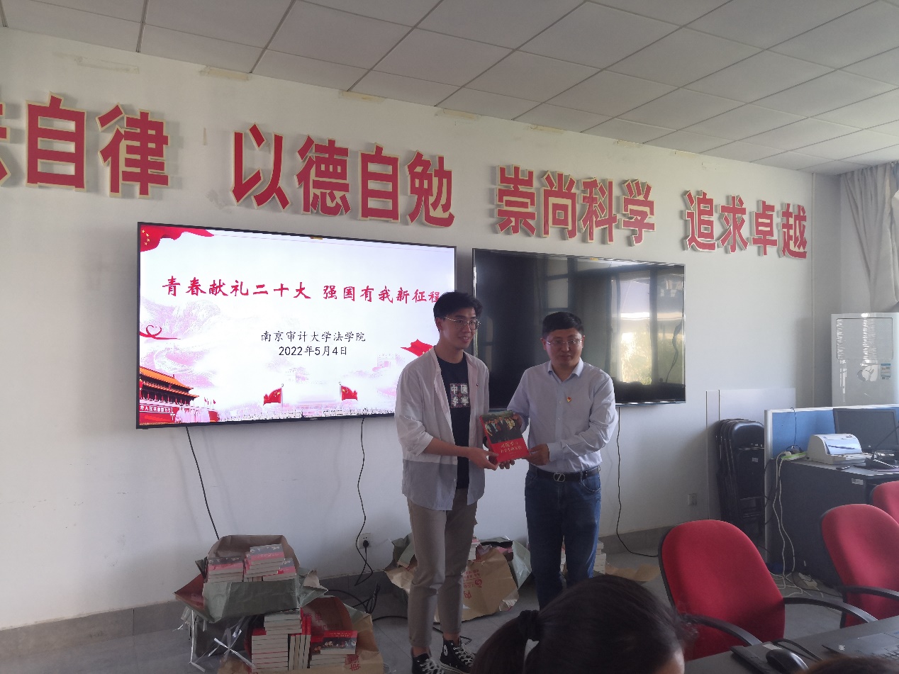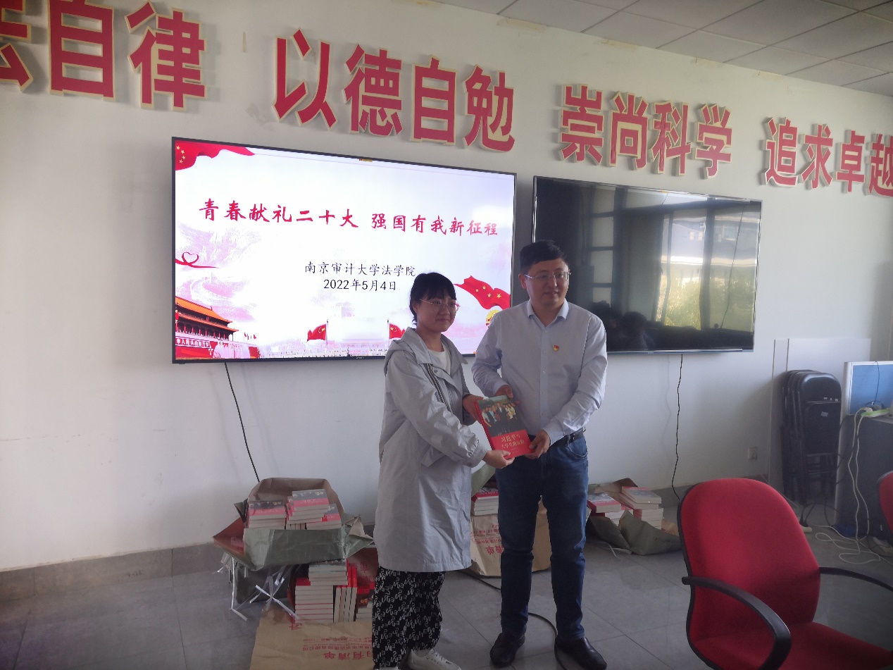 观看完视频后,研究生党员冀硕和袁俊杰同学分别发表了观后感言,冀硕同学从习近平总书记在人大座谈时的讲话精神进行展开,概括了习近平总书记对青年学生的要求和期望。袁俊杰同志则是以一位青年医护朋友的故事进行展开,概括了当代青年应有的奉献精神。刘宏宇书记也现身说法,分享了自己在南京大学读书时去灵丘县进行支教时的经历。并为参会的每位同学赠送《习近平与大学生朋友们》。