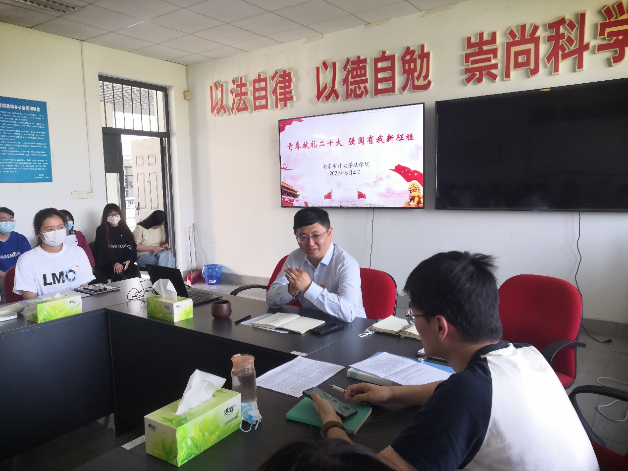 最后,刘书记指出,在疫情防控期间,学院积极为同学们开展了诸如考研辅导、法学趣味、法学理论与实践等诸多讲座。希望各位青年党员同志在学生群体中做好表率作用,积极传递和加强学院和本科生之间的联系,在学习、工作和升学中取得优异的成绩。希望全院广大青年牢记党的教诲,立志民族复兴,不负韶华,不负时代,不负人民,在青春的赛道上奋力奔跑,争取跑出当代青年的最好成绩。