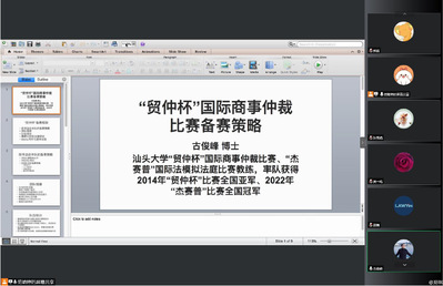 2022年9月23日,无码直播 邀请汕头大学无码直播 副教授古俊峰开展“国家一流本科专业建设·贸仲杯备赛策略”讲座,古老师为汕头大学“贸仲杯”国际商事仲裁比赛、“杰赛普”国际法模拟法庭比赛教练,曾率队获得2014年“贸仲杯”比赛全国亚军、2022年“杰赛普”比赛全国冠军。此次讲座于线上举行,无码直播 多位老师参加。
