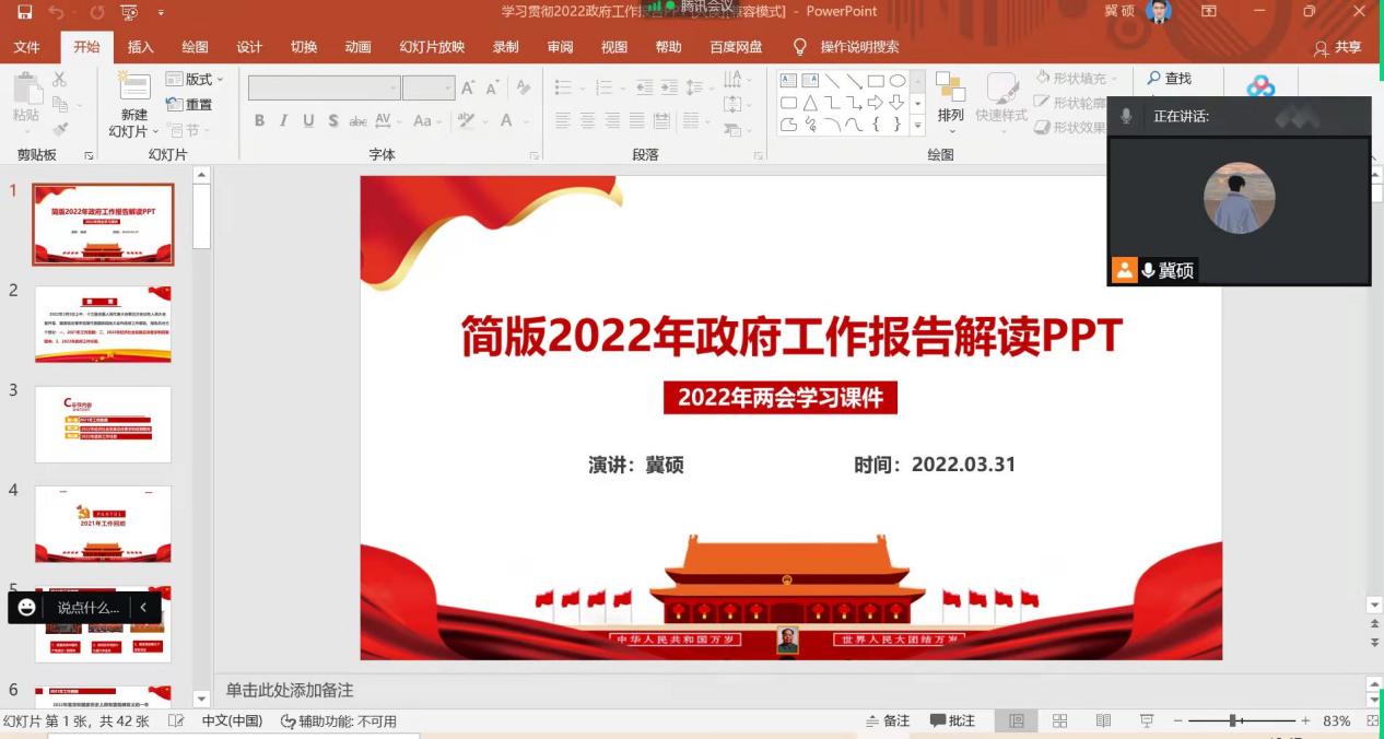 冀硕同志首先带领大家回顾了2021年党中央工作成果,主要包括保持宏观政策连续性针对性,推动经济运行保持在合理区间;优化和落实助企纾困政策,巩固经济恢复基础;深化改革扩大开放,持续改善营商环境等。随后,冀硕同志着重介绍了2022年我国经济社会发展主要预期目标,如国内生产总值增长5.5%左右、居民消费价格涨幅3%左右等,以及保持宏观政策连续性、增强有效性,继续做好常态化疫情防控的发展政策取向。最后,冀硕同志就2022年政府在财政、就业、改革、创新、区域发展、乡村振兴、对外开放、生态发展、民生保障、政府建设、民族宗教和侨务工作、国防和军队建设、港澳台工作、外交工作等14个方面的工作任务进行了简要梳理。