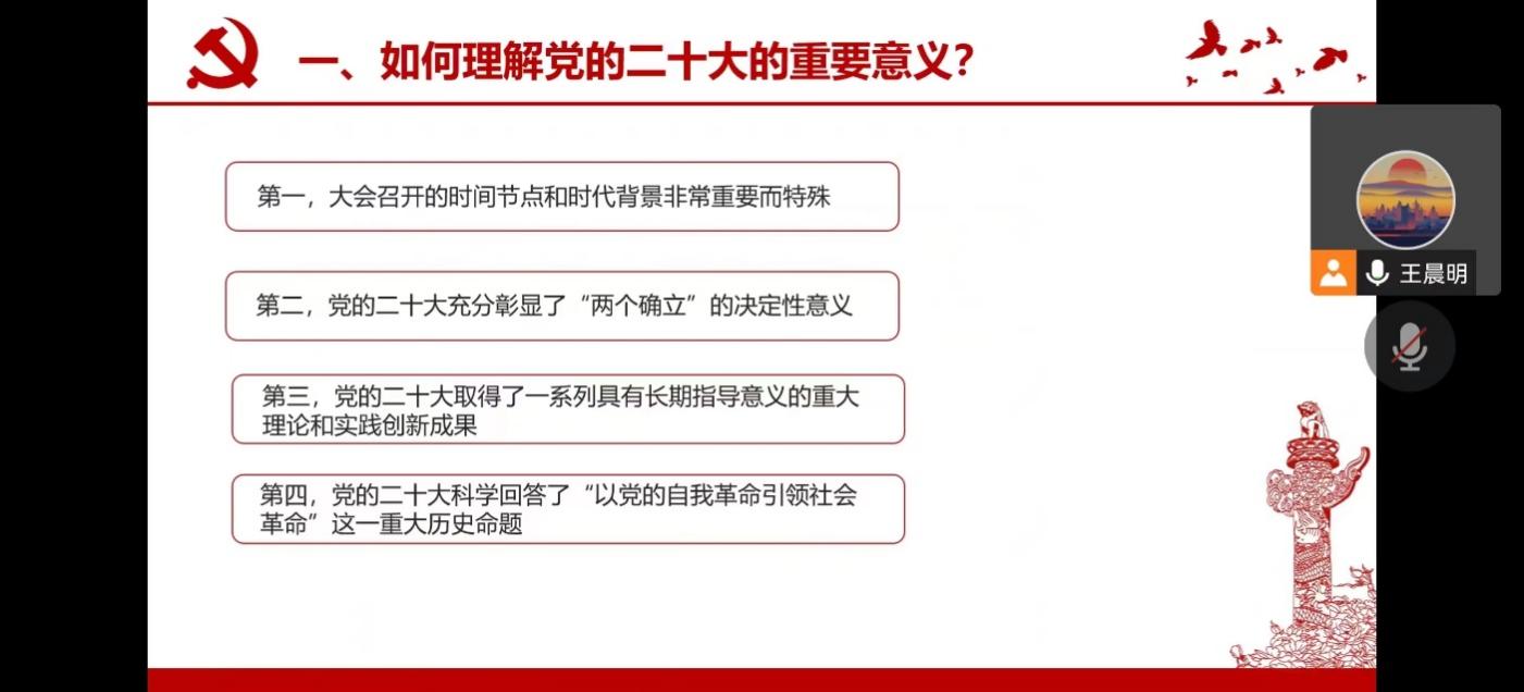 在领学中,王晨明同志重点选取了如何理解党的二十大的重要意义、如何理解中国式现代化的本质要求、如何理解坚持不敢腐、不能腐、不想腐一体推进等五个问题。通过对每一个问题所涉多个方面的详细解读,让与会党员对党的二十大报告中提及的重点论述有了更为深刻的认识与理解,有利于进一步将理论转化为实践。