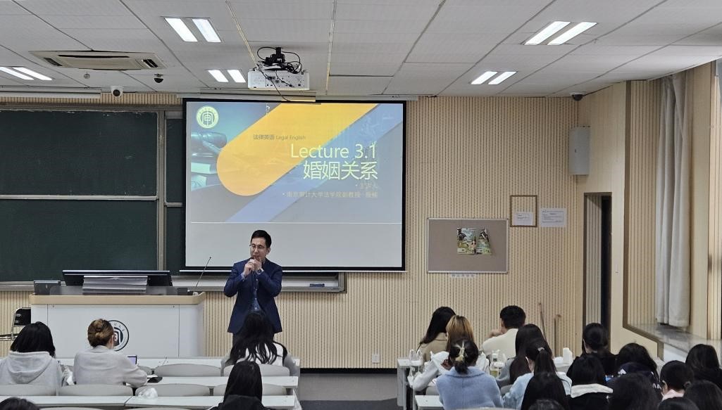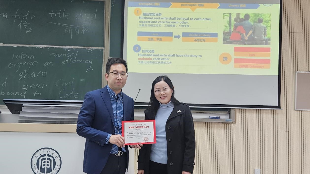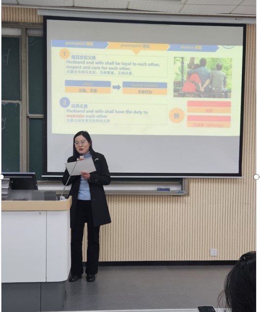 课堂上,殷楠老师主要讲授了婚姻法中核心字词的法律英语表达。殷楠老师采用“线上MOOC+线下拓展”相结合的教学方式,通过其剪辑的法律电影中的英文片段帮助学生掌握纯正的发音和规范用语。同时,殷楠老师充分利用师生手上的智能设备在复习和提问环节形成积极互动,课题气氛活跃,学生专注力较高。殷楠老师讲课信息量大,教学方法先进,教学风格幽默风趣,取得了良好的教学效果。